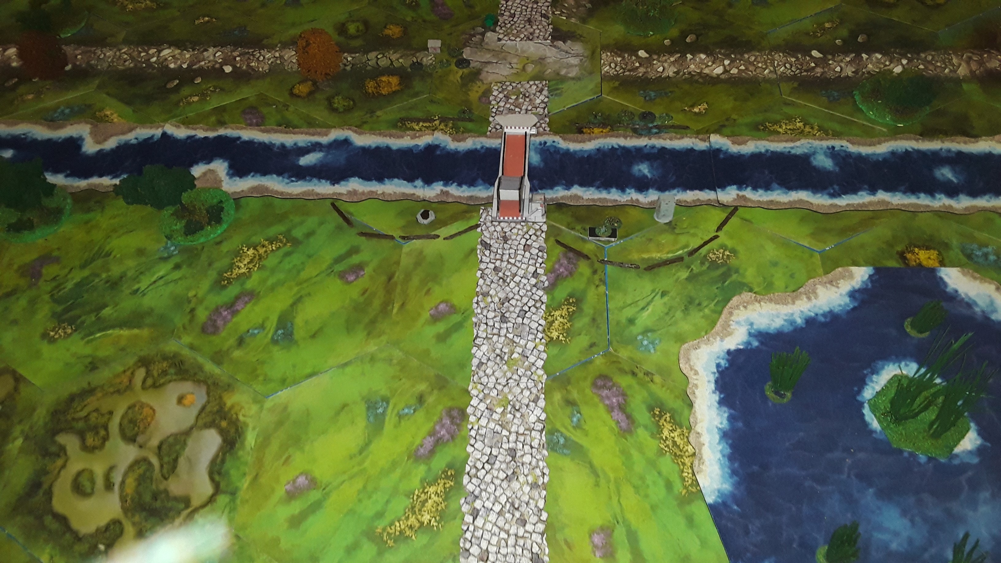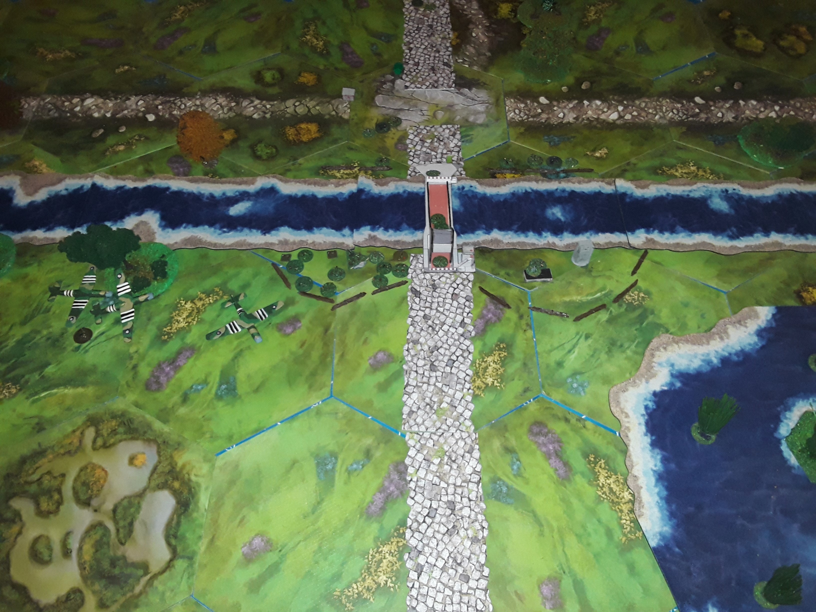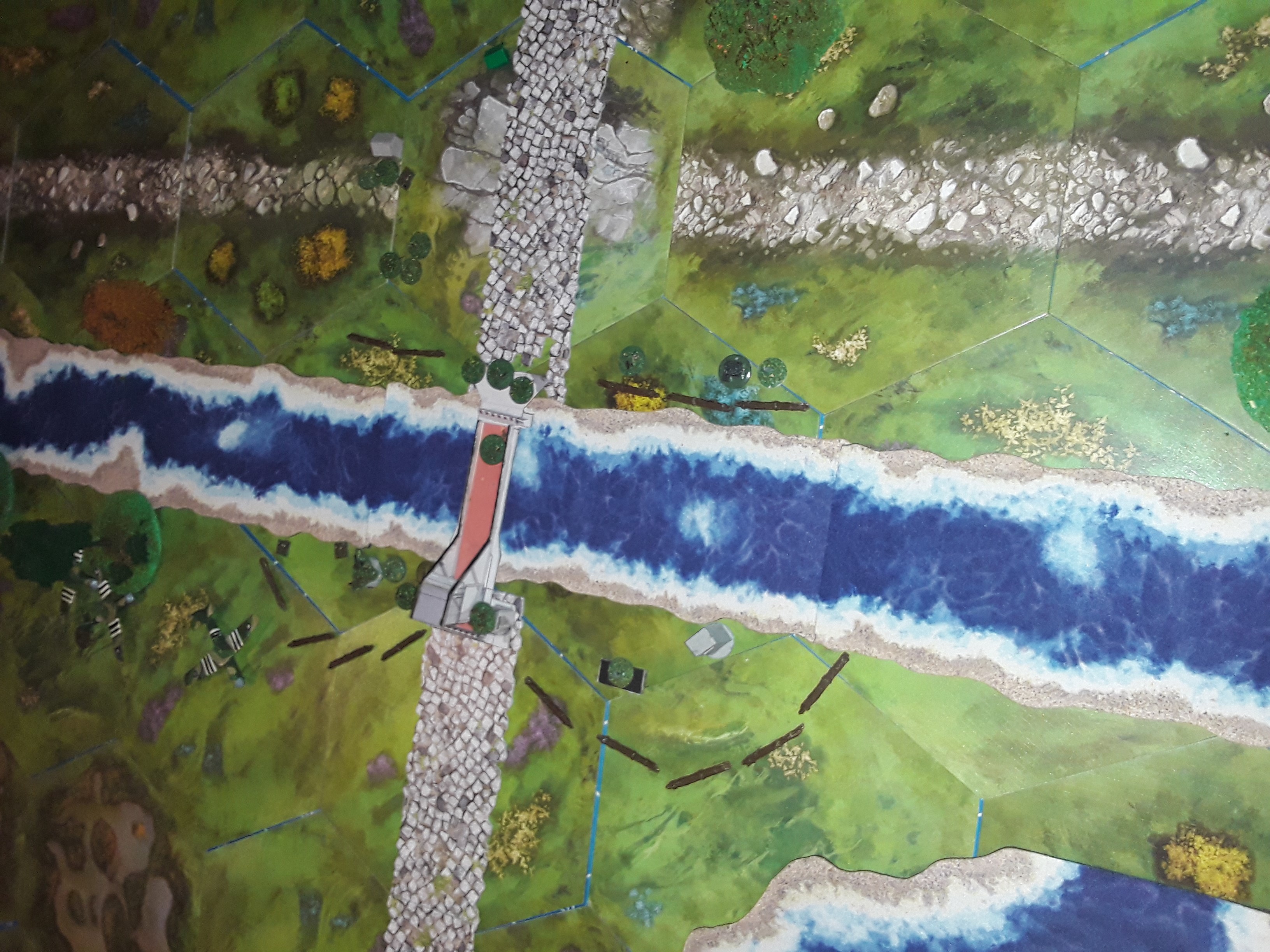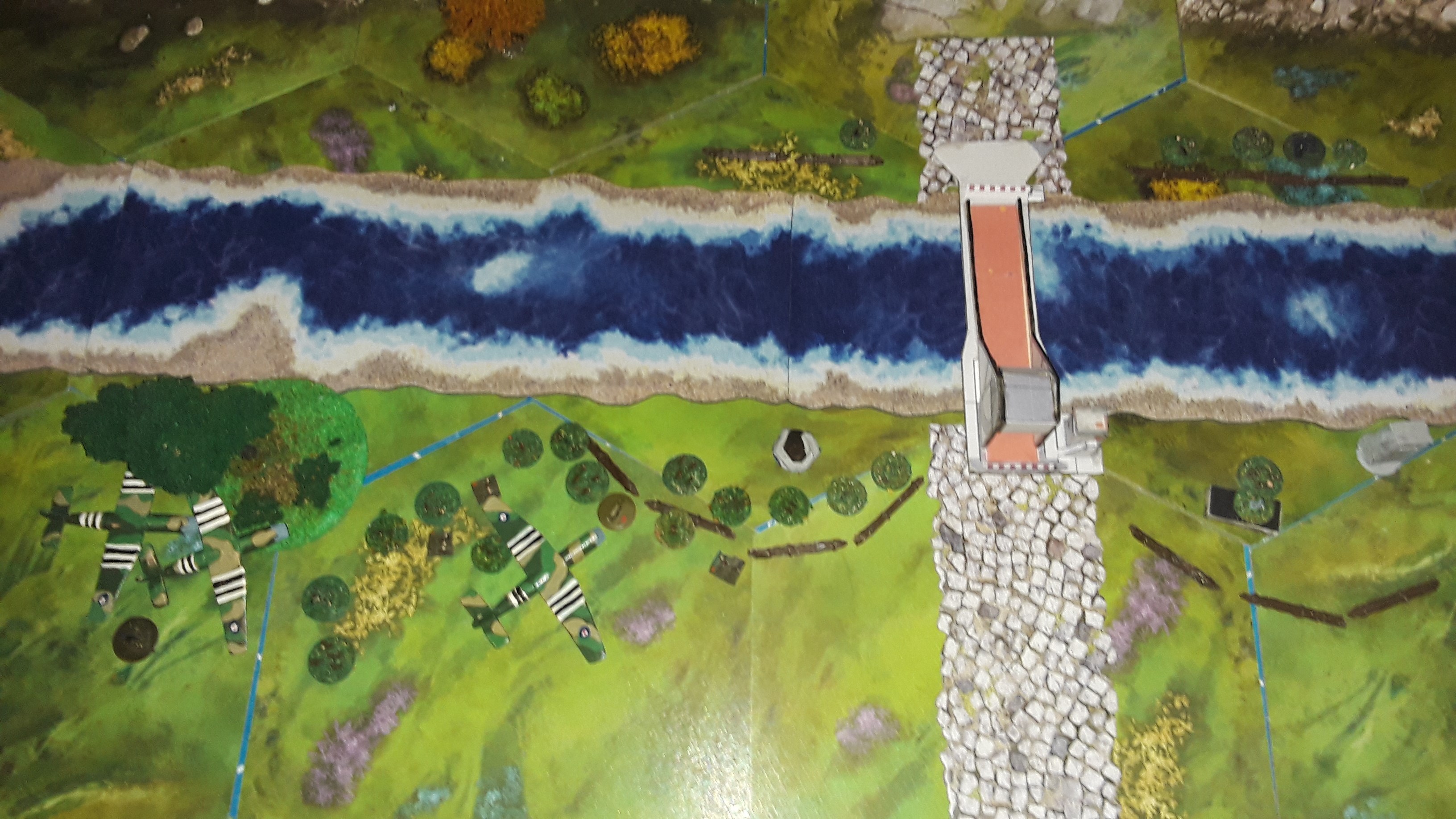 From German side of board. British have secured the bridge, and on both sides of bridge the mmg1 is out, (Lt. Brotheridge takes the trench). Germans on the other side still control the trench, 81mm is about to clear it. Germans from the cafe are moving on the bridge and the right trench.